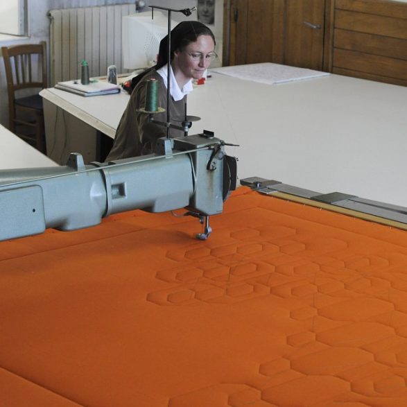 La confection d’articles de literie n’est pas née d’aujourd’hui, mais cette collaboration entre la designer Matali Crasset et les sœurs carmélites de Verdun a quelque chose d’exceptionnel, d’unique. « Nous n’étions pas sûres d’y arriver, le projet initial n’était pas faisable pour nous, il a fallu entièrement programmer la machine. » Ce n’est pas ce qui a arrêté Sœur Laure, et la petite communauté de dix sœurs a relevé le défi de la confection de couettes colorées surpiquées de motifs géométriques imbriqués. Ce beau projet qui insère dans le tissu local des artisans réunis autour de Matali Crasset les motive. Elle reconnait : « C’était un énorme travail pour nous, bien plus que je ne pensais, mais j’ai décidé de tenter le coup et de me lancer dans l’aventure ! »L’atelier n’est bien sûr pas l’activité principale, le temps est équitablement réparti entre la prière, dont les sept offices rythment la journée, et le travail. Chaque sœur y prend sa part, en fonction de ses capacités. Vive, lumineuse, Sœur Laure retrace en souriant sa trajectoire de vie : « J’ai depuis très longtemps ressenti le besoin que ma vie ait un vrai sens, c’est un long cheminement. » Un profond questionnement existentiel la saisit très tôt et l’accompagne y compris pendant ses six années de médecine qu’elle décide de ne pas poursuivre.