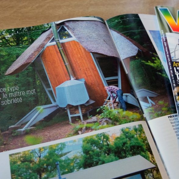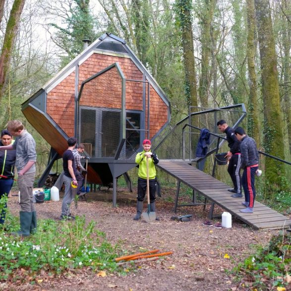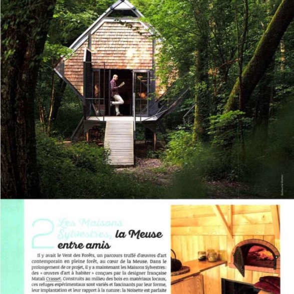Ces créations sont le fruit d’une collaboration entre la designer Matali Crasset, des artisans et des fournisseurs locaux : les ouvriers de l’entreprise Gigot (Varney, 55) ont conçu les ossatures métalliques, les menuisiers de l’association Les Compagnons du Chemin de Vie (Lérouville, 55) ont effectué en forêt la pose du chaume et les habillages bois, l’ébéniste Christophe Rimlinger – Les Meubles de mon Grand-Père – (Villotte-sur-Aire, 55) a fabriqué les mobiliers intérieurs, les élèves du lycée professionnel Ligier-Richier (Bar-le-Duc, 55) ont installé les escaliers, le fabricant Four ‘Grand-Mère’ a construit les fours à bois (Jeanménil, 88) et le chaudronnier Dominique Rennesson a réalisé les petits accessoires (Saint-Mihiel, 55). Le projet a fait le choix de privilégier des matériaux régionaux : le bardage en bois de Douglas a été fourni par l’entreprise Fenneteau Bois (Rambervillers, 88), les « essis » tuiles traditionnelles en bois de Douglas ont été préparé par Guy Vlaemynck (Rupt-sur-Moselle, 88), le roseau de Camargue a été récolté par l’entreprise Jean-Renaud Prévot (Vauvert, 30), le bois de frêne et de chêne pour l’habillage intérieur a été débité par la la scierie Denée (Villers-sur-Meuse, 55).
