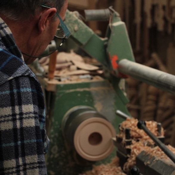Depuis 56 ans, Philippe Huet vit à Souilly. Il y est né en 1954, et son père d’abord agriculteur, y reprend dans les années 60 une ancienne brosserie, à l’endroit exact où, selon la légende locale, cette activité débuta en France, en 1741. Le développement de l’atelier doit beaucoup alors aux différentes sortes de brosses fabriquées, pas loin de 2000 par mois, aujourd’hui remplacées par d’autres techniques de nettoyage. En 1968, « la révolution couvait », la crise en tout cas. Quelques ajustements de production, et ce sont des formes pour les chaussures, puis, dans les années 80, les commandes de quilles d’un fabriquant de jouets qui paieront le tour mécanique : « Ça ronflait, ça n’arrêtait pas. » Pieds Voltaire ou Louis XV, bâton rond ou torsade, pièce unique ou copie, le travail se diversifie en même temps que la conjoncture se tend : « les grandes séries sont parties en Roumanie, moi, c’est comme une épicerie. Je rame, mais mon secteur s’agrandit et j’aime mon métier. »
