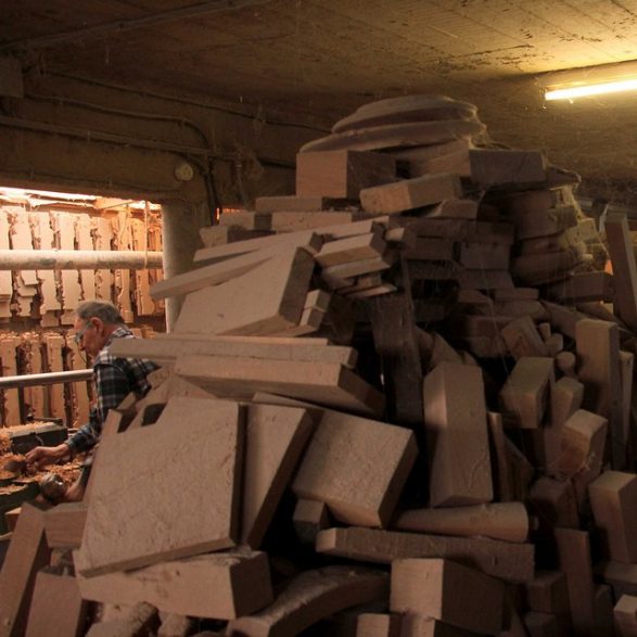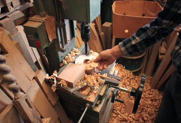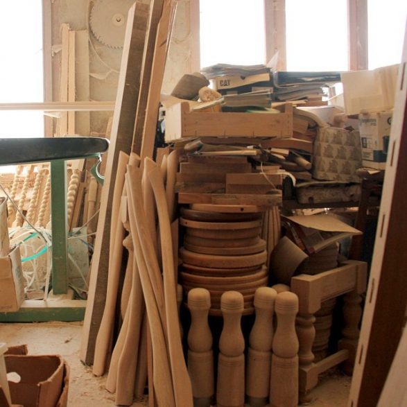 C’est au milieu d’un impressionnant amoncellement de pièces de bois qui envahit tout l’espace de l’atelier que Philippe Huet, chemisette à carreaux et bermuda, reçoit, jovial. Une fine couche de sciure recouvre chaque objet entreposé là, depuis une semaine ou dix ans, sur un tapis de copeaux moelleux. La faible lumière laisse deviner des centaines de balustres d’escalier, manches de pioches et de haches, tabourets, pieds de table et de lampes, quilles, et même une pomme de pin géante. « Je suis le tourneur le plus complet de France » annonce-t-il fièrement, faisant l’article en présentant ses machines dont il est, pour certaines, le seul à encore les utiliser : tour frontal, excentrique, à reproduire, à révolution. Ils permettent à l’un des derniers tourneurs sur bois de Meuse d’honorer des commandes aussi diverses qu’étonnantes, du porte-manteau dit « perroquet » à la crécelle personnalisée, du pas de vis pour relieur à l’ancienne au moulin à poivre d’1,70 m de haut.